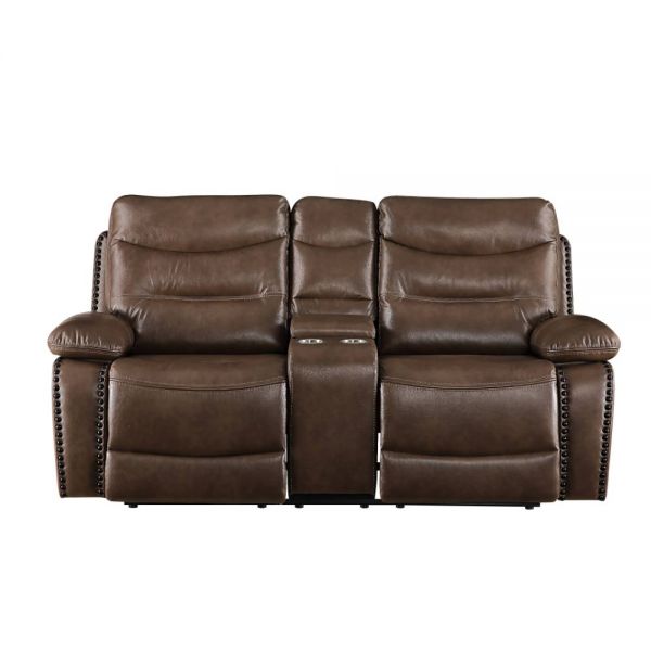 The Aashi motion loveseat is upholstered in soft leather-gel match in a timeless rich brown. Horizontal tufting on the backrest cushions add some style to this piece, while the pillow top armrests ensure total comfort when you nestle into the pocket coil seats. The loveseat includes a storage console with cup holder for convenient access to your favorite beverage. Bring home the relaxing Aashi motion loveseat, and get ready to lean back and say .. "Ah..."