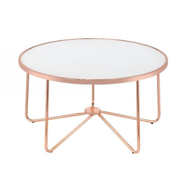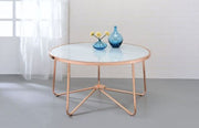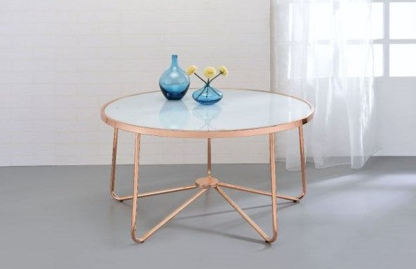 This Alivia modern occasional table brings a unique yet classy look to your living room. With effortless infusion of frosted glass and unique retro inspired rose gold metal base, this piece will naturally blend in your living room, making it a statement of any room decor.