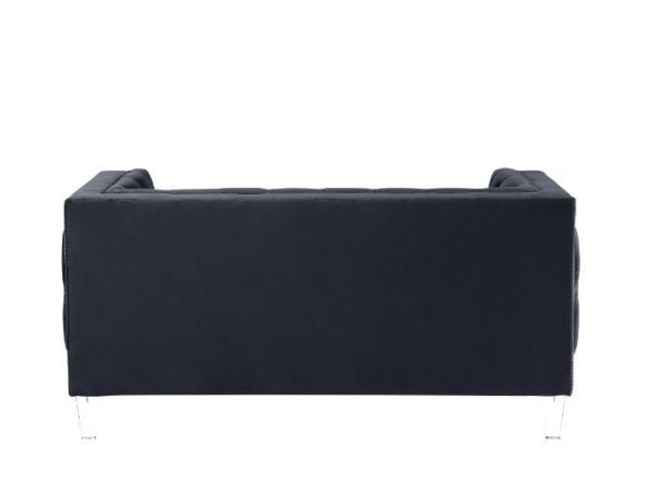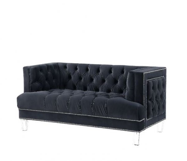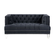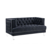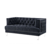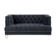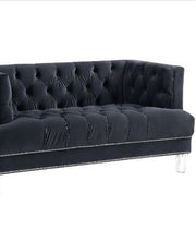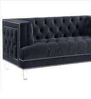 • Sophistication meets modern with the Ansario living room collection. The rich blue velvet adds character to any room. Showcasing a square back, high arms, and nail-head trim, feature button tufted accents. The acrylic legs give off a modern vibe to the pieces. The full foam seats ensure that your next TV binge will be done in complete comfort.