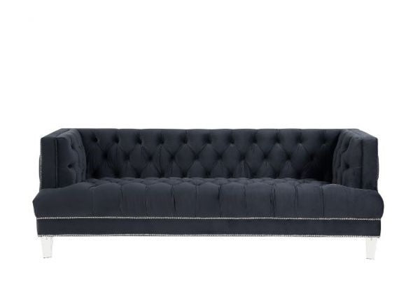 Sophistication meets modern with the Ansario living room collection. The rich blue velvet adds character to any room. Showcasing a square back, high arms, and nail-head trim, feature button tufted accents. The acrylic legs give off a modern vibe to the pieces. The full foam seats ensure that your next TV binge will be done in complete comfort.