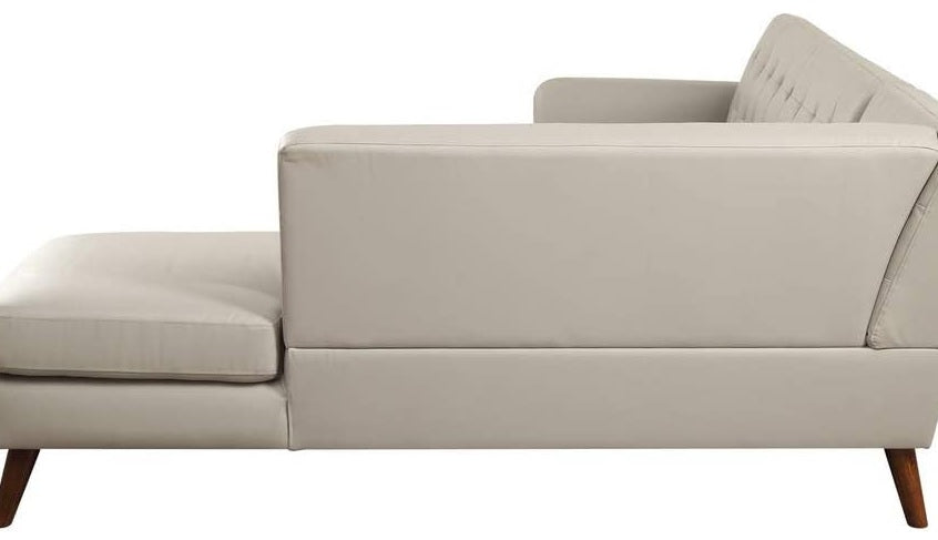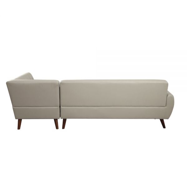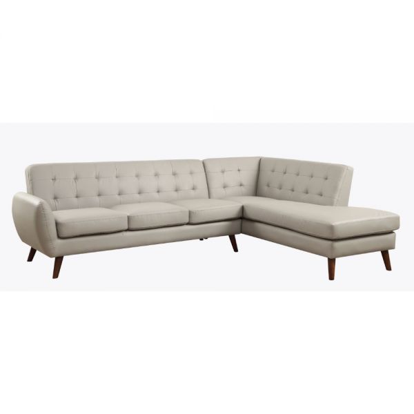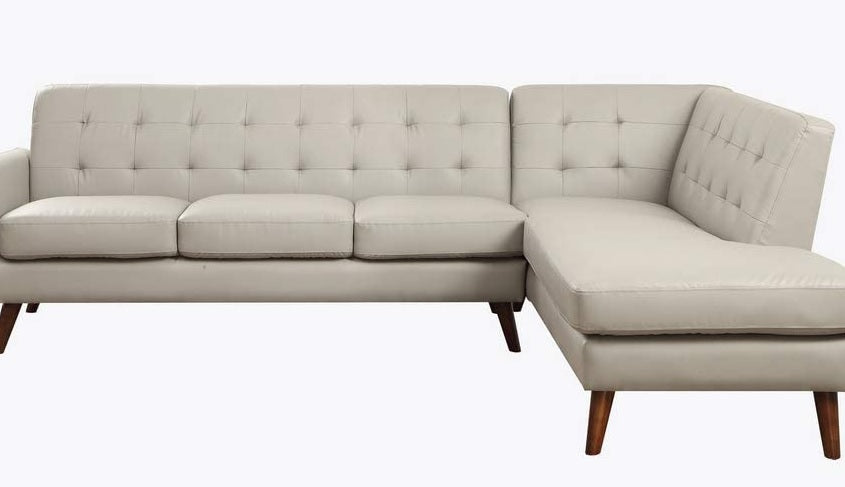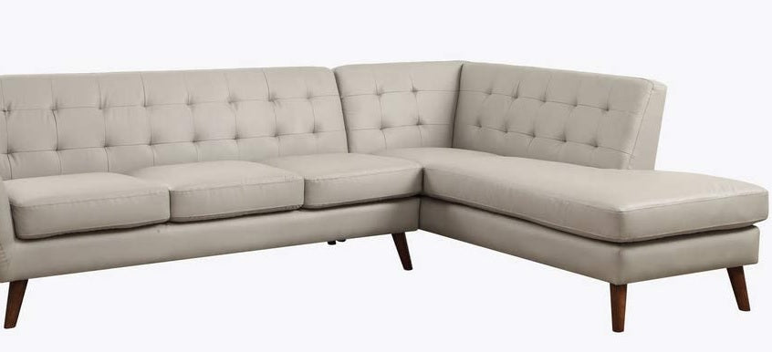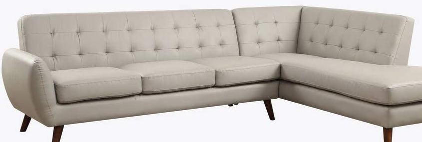 An uptown state of mind, this 2-piece sectional is for the hipster with a unique sense of style. Tightly upholstered with accent tufting on the back supports. Upholstered in gray or black PU and finished in espresso, this sofa will brighten your living space. Making this the ideal piece to have. KD, Sectional Sofa "L" Shape Sectional: LF Sofa, RF Chaise (Not Reversible/No Storage) Features: Buttonless Tufted (Backrest) Tight Back & Seat Cushion (S: 1+3, C: 2+2) Seat Construction: Pocket Coil, Inside Frame: Wood, Foam, Cushion Size: 12"H Armrest: Thin Curved, Size: 6" x 32" x 24"H Wood Tapered Leg: Espresso Finish, KD Material: PU (Solid Pattern); NO Pillows