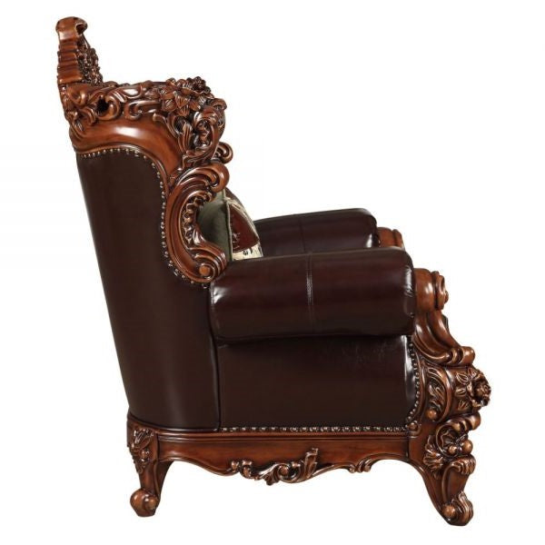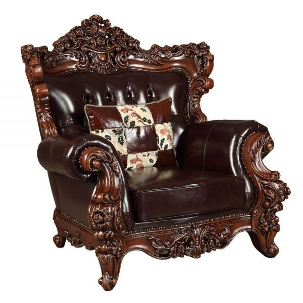 • With espresso color and classic crafted design will let your living room never go out of fashion. The Forsythia collection is a traditional design, with its classics curve upholstered tight back wrapping around with an elegant cut out at the center top. The sofa is accented with a solid wood frame that flows into concave arced front arm which create a great visual silhouette. Top Grain Leather MATCH shows the high- end taste of your personality. The elegant design of this sofa allows it to fit into any room Decor.