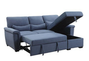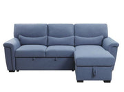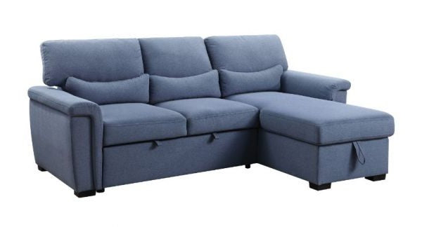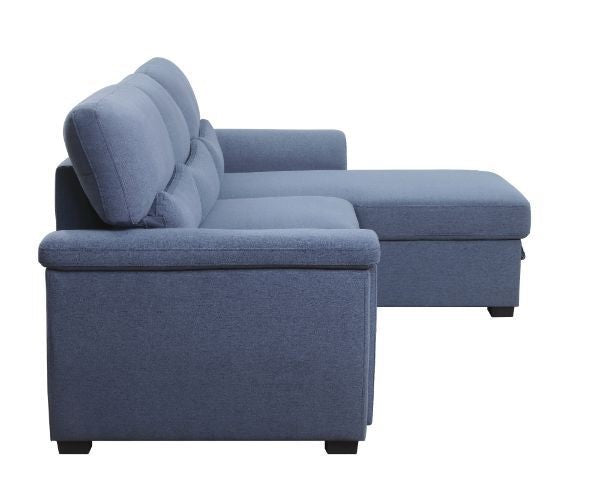Give you luxurious comfort, whether you are sitting or lying down. Soft blue fabric fully covering the sofa makes your living room feel calming and relaxing, while pocket coil seating and adjustable headrests give comfortable and sturdy support. Brilliant multi-function designs are seen throughout this versatile sofa, like a pull-put loveseat and storage chaise. Serving as more than just a sofa, the Noemi Sectional Sofa will impress all of your guests.Storage Chaise, Loveseat with Pull-Out Bed, Reversible Chaise and Loveseat, Pocket Coil Seating, Tight Seat and Back Cushion
