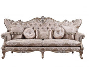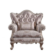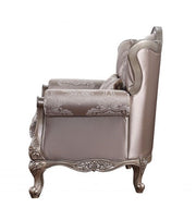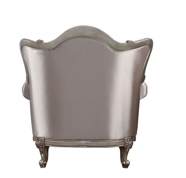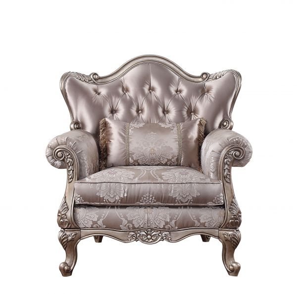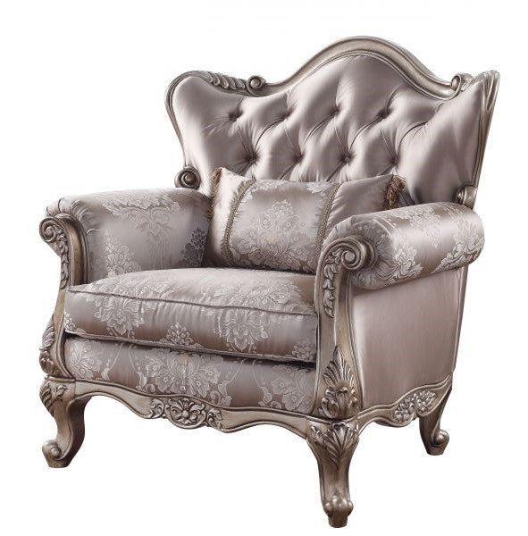 • The Jayceon chair is gorgeous, with shimmery fabric upholstery that highlights the champagne finish of the wooden frame. Button-tufted seatbacks wing out under carved arches. Loose seat cushions are upholstered in a floral patterned fabric that extends over rolled arms. A scrolled floral motif adorns each piece in this addition to Acme's exclusive design collection.