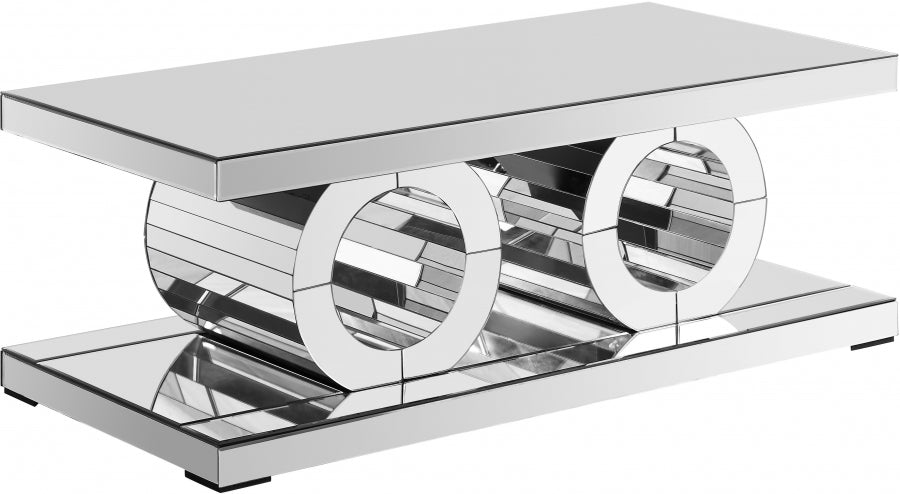 Make this Jocelyn coffee table the center of attention in your living room. This handsome table features a bold design with a geometric footprint that's sleek, chic, and modern. The surface areas of the table are covered in mirrored accents and crystal acrylics, adding depth and dimension to your room while upping the piece's wow factor. The large surface area gives you room for displaying books or other collectibles. Pair it with other items in the Jocelyn collection for a coordinated, modish finish.