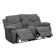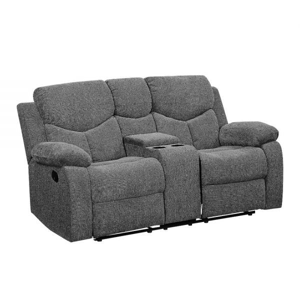 Functional and comfortable the Kalen living room collection makes it easy to unwind. With endless features to make entertaining guests a breeze. The sofa features a drop-down table and reclining functions. Choose between a standard loveseat or a loveseat that includes a console with two cupholders and a flip-top storage space, ideal for keeping remotes handy; both offer reclining functions. The recliner chair features a glider mechanism. The soft chenille upholstery and pocket coil seats mimic a cloud.