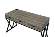 Industrial elements shine in this mixed-material desk. Double X-cross leg supports in sand black support a smooth, pale gray wooden table top. There's plenty of room for storage as three drawers are featured on the front, while an integrated USB and power outlet keep your computer powered up.