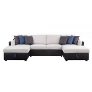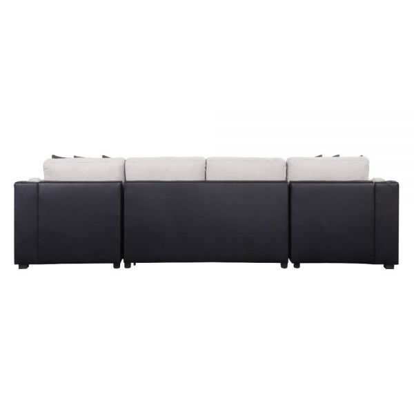 The Merrill sectional sofa provides ample space for snacking, snoozing, and relaxing! Upholstered in a sharp combo of beige fabric and black PU, this substantial U-shape sectional includes not only a pull-out sleeper with full foam mattress, but also a storage chaise. Square accent pillows are included for extra style while you lounge.Sectional w/Sleeper () Storage: Chaise, 6 Pillows "U" Shape (NOT Reversible) Includes: LF & RF Chaise both w/Storage, Armless Love w/Pull-out Sleeper (Full Foam) Tight Back & Seat Cushion