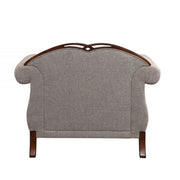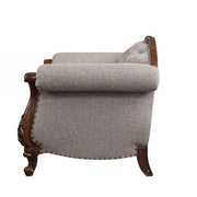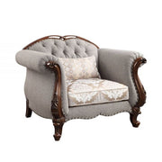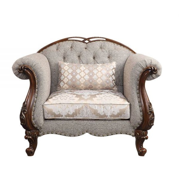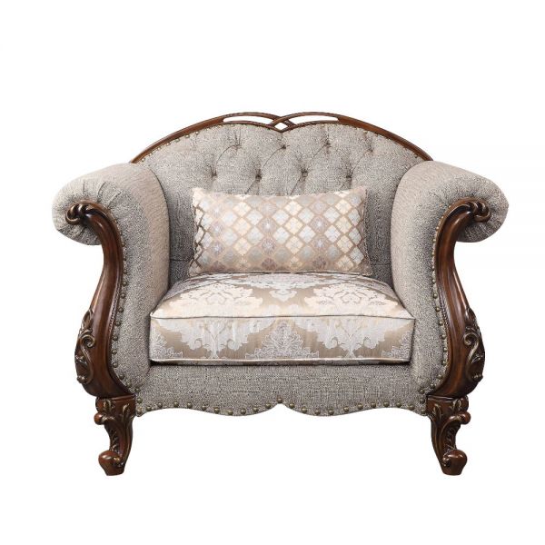 A new addition to Acme's collection of exclusive designs, the Miyeon chair in cherry finish is full of handsome details. Nailhead trim along the padded seat base runs up the scrolled arms and arched seatbacks. Button tufting on the seatback makes the fabric upholstery look especially cozy. Raised floral motifs embellish the Queen Anne legs of the piece.