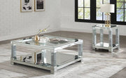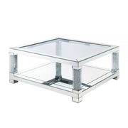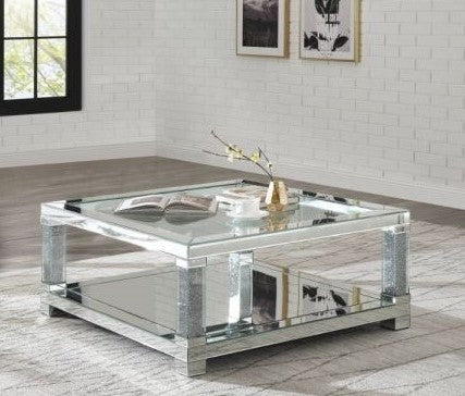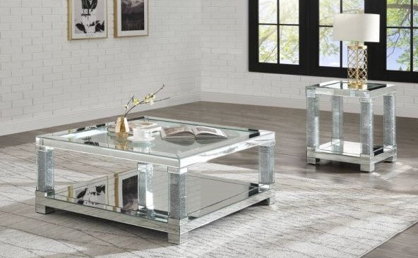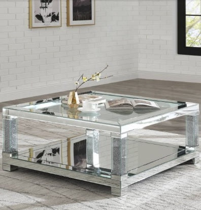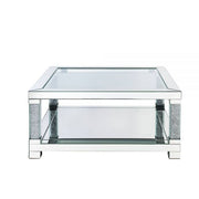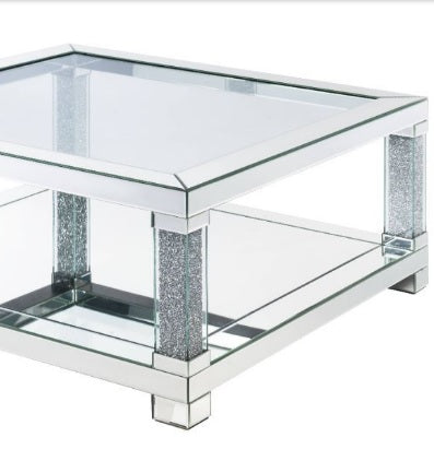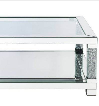 Go full glam with this Noralie occasional table. The beveled mirrored frame and glistening inlay faux diamonds will reflect light and make any room appear larger. The glass table top is ample enough for displaying various decor items while the bottom shelf provides more storage space to suit your needs. Matching end tables available.