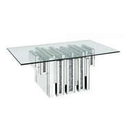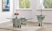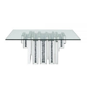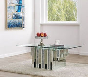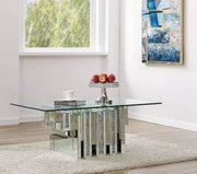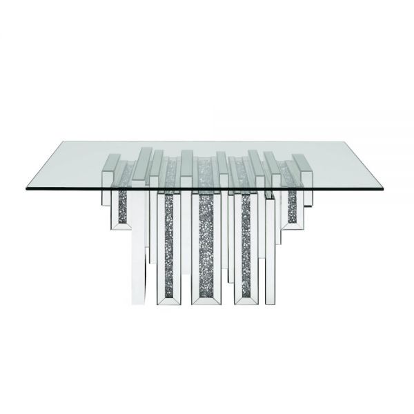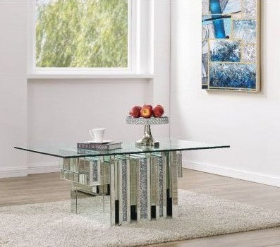 Brighten up your space with this mirrored and faux diamonds Noralie coffee table. With its unique pedestal base, this table is one your friends and family will all be envious of and will be talking about for years to come. Glam meets function with its ample glass table top. You will be able to store and display all your goods. The faux diamond inlay adds the right amount of texture and will reflect light magically. Matching end tables are available.