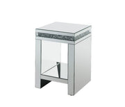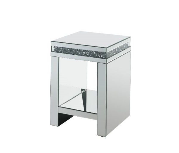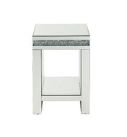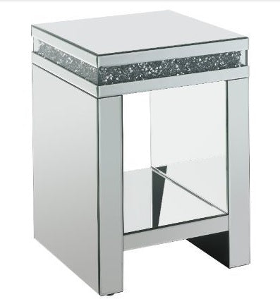 A chic sidekick for your sofa, this glamorous end table provides the perfect space to spread your magazines after a long day. Scatter light throughout your living space with its faux diamonds inlay and gleaming mirrored finish. A standout on its own or accentuated with your decor. Featuring a multipurpose lower shelf for all your storage needs. The Noralie End Table will make your collection shine and reflect your sense of style.