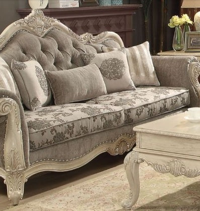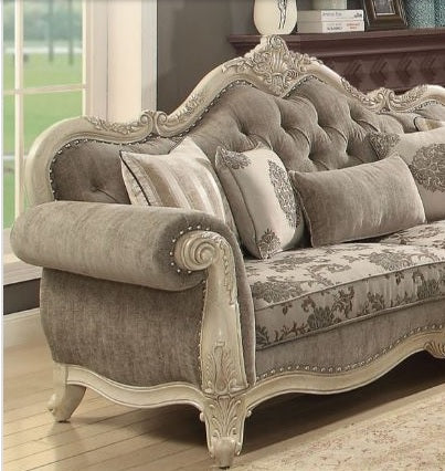 The Ragenardus collection harmonizes traditional details with functional design to accommodate today's styles. This sofa set features tight seat and back cushion, crown and raised scrollwork ornamental trim and button tufted backrest. Accent pillows are also included to make your living room more splendid. Choose from antique white finish or vintage oak finish with its matching occasional tables, this collection will create an elegant and fabulous living room environment for your home.