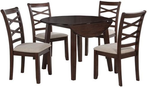 This five-piece dining set invites connection with timeless charm and everyday warmth. The round table, finished in rich dark brown, provides an intimate setting for shared meals and easy conversation.Read More