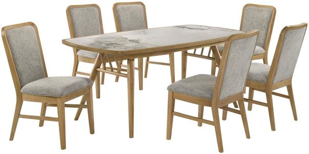 The side chairs provide plush grey upholstery, curved backrests for support, and gently rounded frames. Crafted for comfort and durability, this set seats six with effortless style.