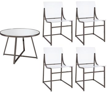 Dining chairs feature clear acrylic backs and minimalist metal frames
