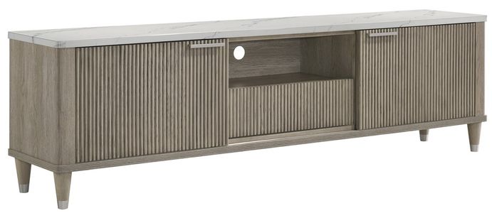 This entertainment console radiates modern sophistication with its organic, neutral finish and distinctive vertical ribbed design. Crafted from high-quality materials, it offers ample storage with sliding doors and open shelving, perfect for organizing media devices and accessories.Read More
