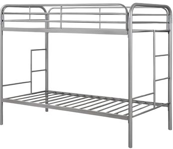This twin-over-twin bunk bed features a sleek silver finish and sturdy metal frame, offering both durability and modern appeal. Guardrails and an integrated ladder ensure safety and convenience. Ideal for shared bedrooms, it maximizes space while maintaining a clean.Read More