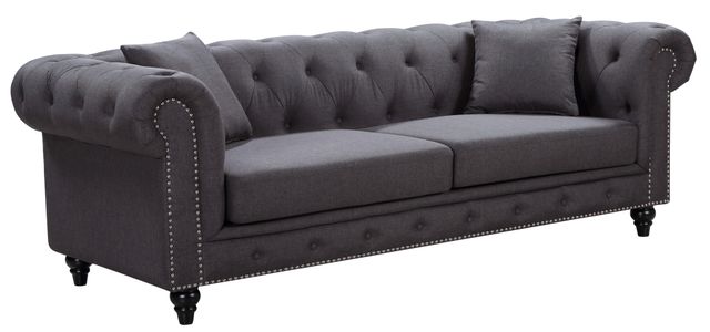 Elegant and eye-catching, the stunning Chesterfield Living Room from Meridian Furniture is the perfect addition to any space. Rich Linen covers the plush, comfortable seat, padded with high-density foam and modern tufted design. Strength and beauty is guaranteed with a solid wood frame and legs. Features a nail head design on the arms and includes matching throw pillows.Read More