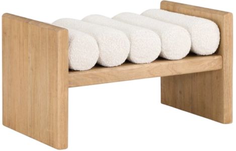 Add originality to your home with this unique bench from Meridian Furniture's Waverly collection. Crafted using solid rubber wood with a natural finish, this bench makes a bold statement in any living space. Its H-shaped design holds five rich cream boucle fabric cushion rolls on top, providing a comfortable place to sit for you or your guests.Read More