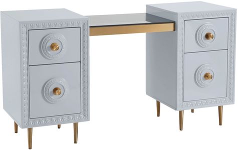 Work in fabulously glam fashion with the Bovey desk. Featuring a lacquer finish with intricate molding, glass top, gold hardware and tons of storage space, productivity is about to become a whole lot more stylish.Read More