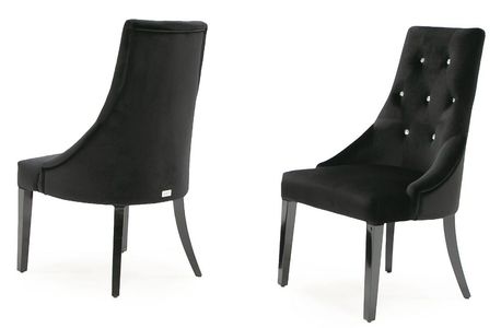 The Charlotte chair is upholstered in a soft velour fabric and enhanced by crystal tufts and quality stitching. High gloss black legs slightly curve outward to create movement in the design. Available in grey, purple and black velour.Read More