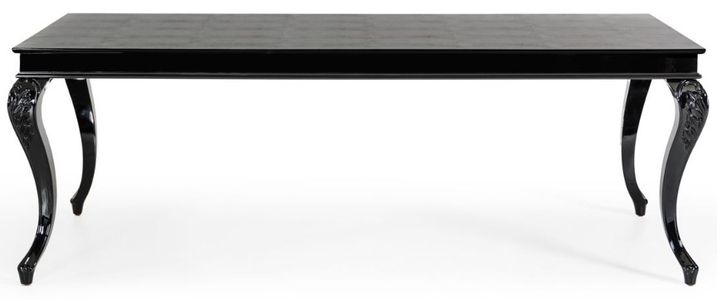 The A&X Sovereign transitional legs and finishes pair perfectly with the modern top and create an eye grabbing style. Black curvy legs with a gloss finish accent the large rectangular dining table. As part of the A&X Collection, the Sovereign dining table features the signature laser-cut crocodile texture on the table top with a rich black lacquer finish. Pictured with the Sovereign chair.